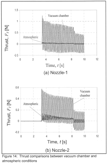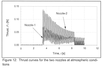 From table 2 it can be seen that the peak thrust achieved under vacuum conditions for nozzle-1 is almost 13 times better than the thrust achieved under atmospheric conditions. That is more than a 1000 % increase in the peak thrust achieved with the same nozzle. Also, the total impulse achieved shows an increase of more than 10 times. That is a 920 % increase in the total impulse achieved with the same nozzle. The reason for the increase in thrust is due to the fact that in the vacuum chamber there are no Shockwaves present in the nozzle. In the case of the vacuum chamber tests, the backpressure was low enough to ensure that the flow could exit at a very high velocity without Shockwaves being present in the nozzle.