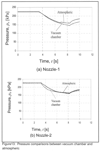 Tests were conducted in a vacuum chamber to thereby simulate conditions where the backpressure approaches absolute zero. In the vacuum chamber the pressure was equal to 20 Pa which is low compared to atmospheric pressure. Again there was no mesh in the accumulator for these tests. Nozzle-1 and nozzle-2 were tested, and the results compared with the tests conducted under atmospheric conditions. The pressure in the vacuum chamber at 20 Pa was low enough that no Shockwaves would form in either of the two nozzles. Figure 13 shows the comparison between the pressure curves for the vacuum test compared to the test done under atmospheric conditions for nozzle-1 and nozzle-2. The thrust curves for nozzle-1 and nozzle-2 are shown in figure 14.