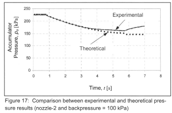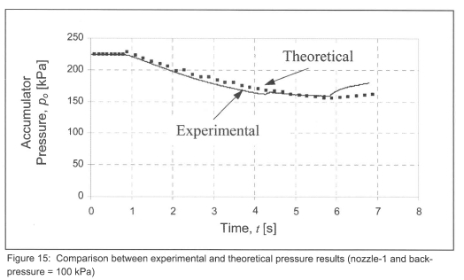 The theoretical model that was compared with the results obtained experimentally was for the case with no mesh in the accumulator. The throat and exit diameters of nozzle-1 were used and the backpressure was set equal to the atmospheric pressure. Also, it was decided to look at the case were the nozzle valve was opened for 5 s before closing it again. In figure 15 the comparison between the theoretical pressure predicted and the experimental pressure obtained in of the accumulator can be seen. Figure 16 shows the comparison between the thrust predicted and the thrust measured experimentally.
