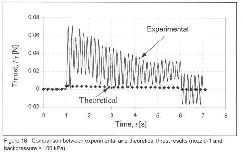 In figure 16 it can be seen that the experimental and theoretical thrust results for the system do not compare well. Shockwaves formed continuously in nozzle-1 right from the time that the nozzle valve was opened. According to Hill15 a shock is strongly affected by interacting with the nozzle boundary layer. The shock can separate the boundary layer and set up a complex flow disturbance within the nozzle, which in turn will greatly affect the shock configuration. It is also stated that the shock inside a nozzle with high exit plane pressure is definitely not plane normal. The simple model that was used in order to calculate the flow through the nozzle, assumed that if a shock formed in the nozzle that it was plane normal. According to Hill15 this is not necessarily the case. The simplified one-dimensional theoretical model, that assumes a Shockwave to form plane normal inside of a nozzle, thus cannot accurately predict the thrust developed if Shockwaves form continuously in a nozzle right from the time that a fluid is exhausted through the nozzle.