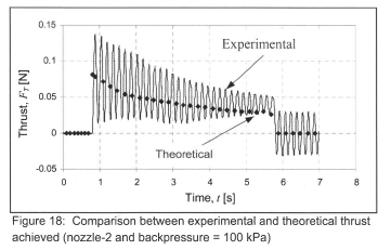 From table 3 it can be seen that the theoretical and experimental results do not correlate very well for the atmospheric conditions. However, under vacuum conditions the total impulse predicted over the 5 s thrust period is out by less than 20 %. Therefore, for the case where Shockwaves do not form in nozzle-1, the analytical model is able to accurately predict the thrust of the system.