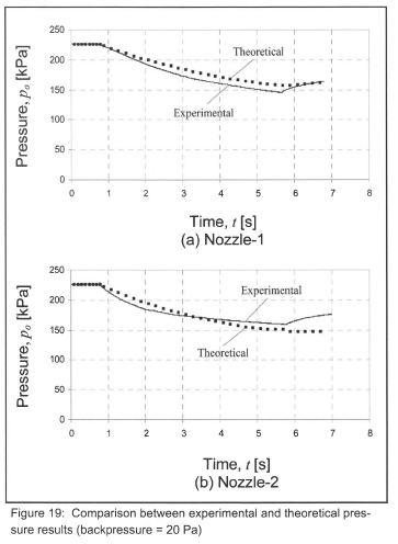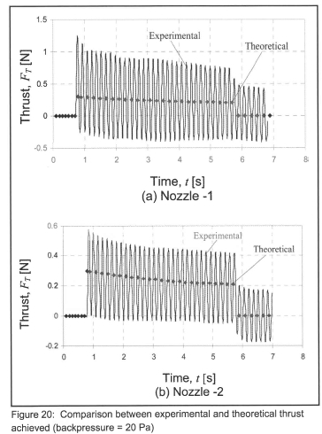 In order to validate the theoretical model the theoretical results were compared to the experimental results. In the first tests done under atmospheric conditions with nozzle-1 the thrust calculated by the theoretical model did not compare well with the experimental thrust achieved. However, in the modelling of the flow through nozzle-2 the thrust did compare well with the experimental thrust under atmospheric conditions. The difference between nozzle-1 and nozzle-2 under atmospheric conditions is that in the case of nozzle-1 Shockwaves form inside of the divergent part of the nozzle as soon as the nozzle valve is opened. However, in nozzle-2, the Shockwave only starts to move into of the divergent part of the nozzle and then only after the pressure in the accumulator drops low enough. Under vacuum conditions the theoretical thrust compared well with the experimental thrust for both of the nozzles.