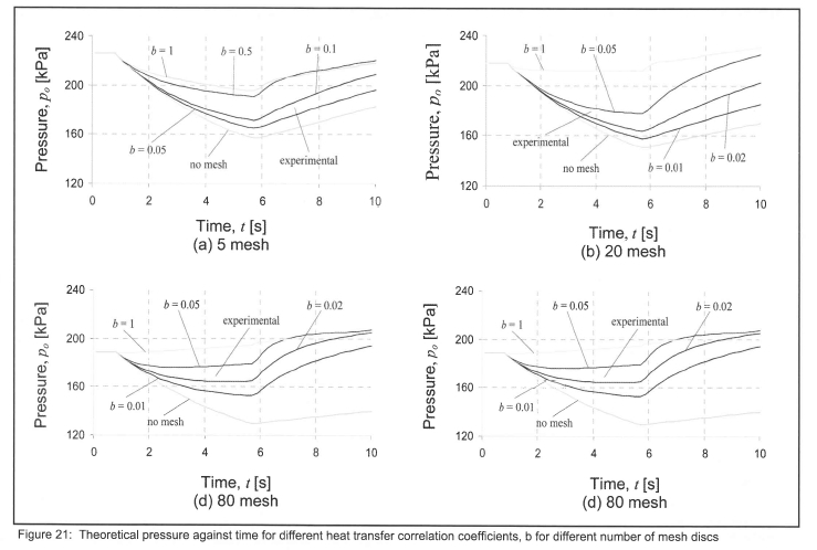 It was decided to incorporate a heat transfer correlation coefficient to take into account the uncertainty of the contact surface area, as well as the uncertainty of the heat transfer coefficient. A new variable b was incorporated into equation 18 whereby the heat transfer from the mesh to the butane vapour could be adjusted, in order to get a better estimate for the pressure in the accumulator. Equation 18 then becomes: