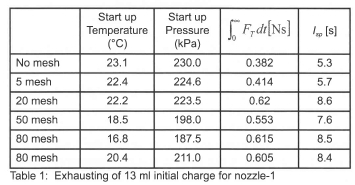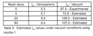 Under atmospheric conditions with no mesh in the accumulator the Isp achieved with nozzle-1 was 6 s. Under vacuum conditions, also with no mesh in the accumulator, the Isp achieved with nozzle-1 was 67.5 s. Under atmospheric conditions with 20 mesh discs in the accumulator the Isp achieved with nozzle-1 was 9.43 s. Table 5 shows that the estimated Isp for the system with 20 mesh discs in the accumulator under vacuum condition is 109.5 s.