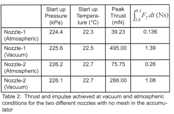 Under atmospheric conditions with no mesh in of the accumulator the Isp achieved with nozzle-1 was 5.3 s. Under vacuum conditions, also with no mesh in the accumulator, the Isp achieved with nozzle-1 was 67.5 s. If the same increase that was achieved under atmospheric conditions with the addition of mesh in the accumulator is assumed under vacuum conditions, the Isp of the system with mesh in the accumulator can be estimated. This assumption is valid only if the flow through the throat of the nozzle is choked, which was indeed the case in the tests that were conducted. Table 5 shows the estimated Isp values for the system with mesh in the accumulator under vacuum conditions using nozzle-1. The Isp - Atmospheric values in Table 5 are the Isp values from table 1.