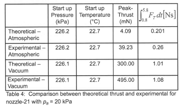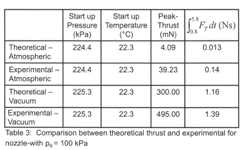 From table 4 it can be seen that the correlation between the theoretical and experimental results under atmospheric conditions, using nozzle-2, is a lot better than was the case when using nozzle-1. For the atmospheric conditions the total impulse predicted was out by less than 30%. The error in the prediction of the total impulse under the vacuum conditions is less than 7%. This shows that the simple model used to simulate the thruster system is able to predict the thrust accurately, provided that there are not Shockwaves inside of the nozzle as soon as the nozzle valve is opened.