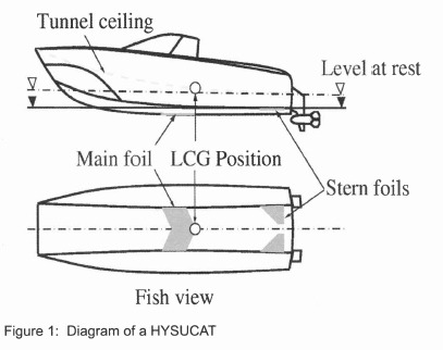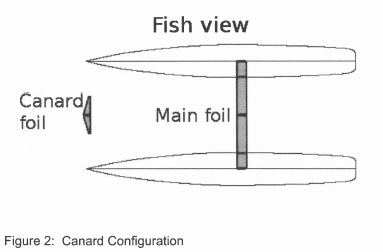 Given that a standard sailing catamaran has rudders near the stern and daggerboards amidships, it would make sense to attach foils to these. If lifting foils are placed elsewhere they would require additional struts which in turn would upset the balance of the boat, thus requiring a redesign in terms of balance. Placing foils on the rudders and daggerboards would therefore allow for a simple 'add-on' hydrofoil design. The foils are also placed in relative safety (against impact or entanglement) below the tunnel of the boat and do not extend past the beam of the boat. The main foil will be no deeper than the daggerboards, if impact occurred with a sandbank or any submerged body, it is likely that it would have occurred in any case and the same can be said of the rear foils and their attachment to the rudders. However, the longitudinal centre of gravity (LCG) is intuitively expected to be not far aft of the main foil resulting in an aircraft type configuration with most of the load on the main foil and as a result, poor pitch stability. Since pitch-pole is a problem for sailing catamarans, the stability of this configuration was considered to be marginal without the LCG relatively far aft or a trim control system and a canard-type configuration (figure 2) was used. The aircraft configuration is, however, very similar to the standard HYSUCAT configuration that has proved successful on power catamarans.