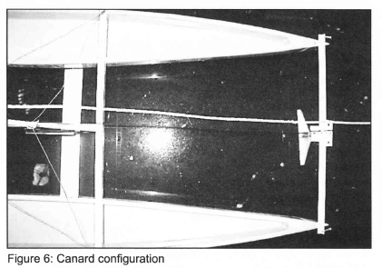 Although the canard configuration remained stable throughout the speed range, it was found during experimentation that the pitch stability was not robust and sudden accelerations (or perturbations in trim) would result in the boat moving to the bow down running condition. Practically this meant that a trim control system would be required to provide adequate performance and stability. It is therefore recommended that the HYSUCAT type configuration is investigated but the main foil is moved forward resulting in a more even load distribution between the foils, thus increasing pitch stability. Since a stable configuration was not achieved without upsetting the position of the CLR by the addition of lifting foil supporting struts, the main foil may be made independent of the dagger-boards and supported by two struts mounted on either side of the tunnel.