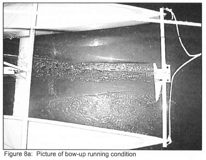 Normally the model ran at positive trim angles (bow up) but it was noted that if a forward pitching moment was applied (the trolley accelerated) the model would reach a new equilibrium with a low trim angle (bow down). This not only yielded an undesirable increase in resistance but would also not be stable in terms of yaw stability) due to the forward movement of the CLR) and in waves would be susceptible to pitchpole. Figure 8 shows the two running conditions.