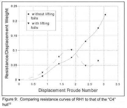 Since a reduction in resistance with the addition of lifting foils is only expected above a displacement Froude number of 2, a retractable foil system is recommended, to be engaged only in suitable conditions.