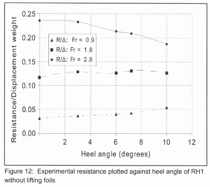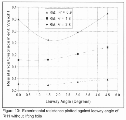 Figure 10 shows the effects of leeway on the resistance of RH1 without lifting foils. The change in wave interference resulted in a slight increase in resistance with leeway angle for low and moderate speeds. For high speed (Fr ≈ 2.8) a reduction in resistance is observed at moderate leeway angles.