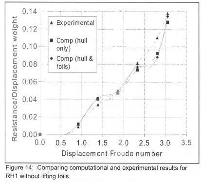 Figures 14 and 15 shown the comparison between computational and experimentally determined results for the resistance curve without and with lifting foils attached, respectively. From figure 13 it can be seen that the computational results for the case of without lifting foils agrees very well with the experimental results.