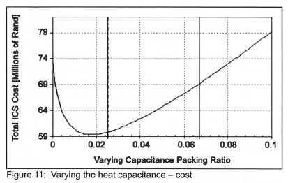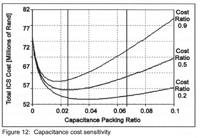 As can be expected the total ICS cost will change with a variation in capacitance as shown in figure 11. The minimum system cost occurs at a packing ratio of 2 %. From the graph it can be seen that increasing the packing ratio to 6.5 % (which gives the minimum storage volume) results in relatively huge increase in cost - approximately 10 million Rand. Such a large increase is not justified. As a result, a packing ratio of 2.5 % is chosen as this gives a cost which is fairly close to the minimum and not too far from the minimum height (or storage volume).