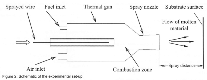 The schematic diagram of the thermal spraying experimental set-up is shown in figure 2. The equipment used in the experiments was the HVAF thermal spray gun developed specifically for Zn-Al wire spraying. The thermal gun operates on paraffin Jet A-1 and compressed air. Fuel is supplied to the thermal gun by a fuel pump. The compressed air requirements are similar to grit blasting, however, there is no need to dry compressed air, hence a basic water trap is sufficient. The required fuel/air ratio for the combustion process is set on the controller as specified. The thermal gun operating parameters are shown in table 1.