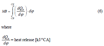 Mass fraction burnt is the integral of the heat release calculation. This result is scaled to 100 % and shows the progress of combustion accordingly. At the ignition point (6° before TDC), 0 % of the mass fraction is burnt and it is assumed that at the end of the calculation (360°CA), 100 % of the mass fraction is burnt. These conditions are the calculation limits for the integral. Merker10 recommends the following equation to calculate the combustion progress: