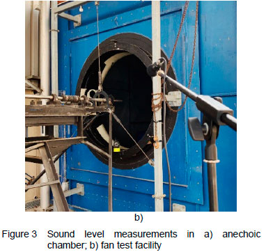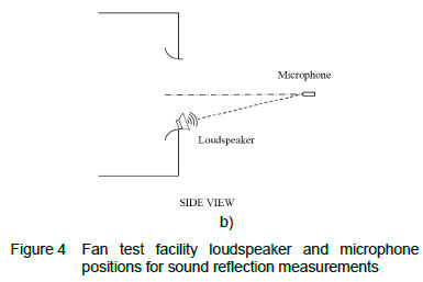 First, the source, a loudspeaker, is characterised by measuring the free field response at pure 1/3-octave center frequency tones ranging from 100 to 20 000 Hz in an anechoic chamber (the lowest measurable frequency that the loudspeaker can produce is 100 Hz). The anechoic chamber is of the radio-frequency type as it is lined with pyramidal radiation absorbent material (RAM), however it also provides sufficient suppression of acoustic waves and has been used for this purpose in the past. Sound was measured at various frequencies. The effect of reflections on the measured sound is suspected to vary with frequency as the fan test facility is in close proximity to numerous flat reflective surfaces of a variety of materials, including glass, brick and mesh screens, along with metal structures such as the fan motor and rotational shaft (figure 3b).