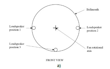 At microphone position 1 and 2, the loudspeaker at position 1 is partially shielded due to the fan rotational shaft (see figure 3b). This is also the case at microphone position 3 and loudspeaker position 2. These cases were considered to include the effect of an obstruction directly in the acoustic wave path between the loudspeaker and microphone.