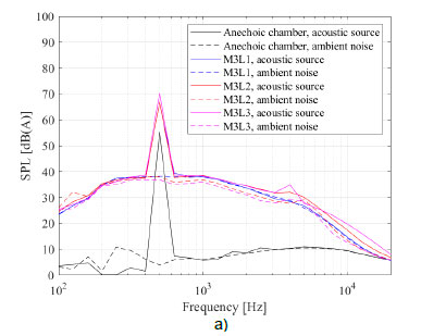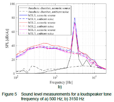 As examples, in figure 5a and b, the loudspeaker emits noise at a tone frequency of 500 Hz and 3150 Hz, respectively. The sound level measurements are shown in 1/3-octave band frequencies for the microphone at position 3 ('M3') and the loudspeaker ('L') at all three positions. The tonal peaks at these frequencies clearly dominate the measured spectra. From each set of measurements such as in figure 5a and b, only the tone frequency of each measurement is considered henceforth. The ambient noise is logarithmically subtracted from the acoustic source noise for fan test facility and anechoic chamber measurements following equation (1).
