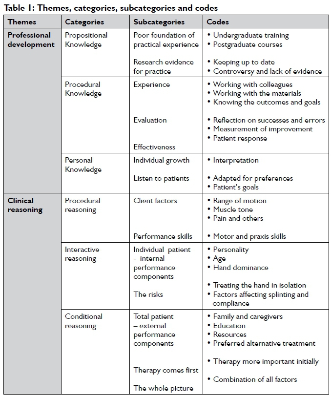 They acknowledged that their professional knowledge was developed over time, particularly with the skill of making splints and problem solving in this field of practice. They also acknowledge that their greatest learning was achieved through learning from other experienced colleagues and in clinical practice. Participants in this study do not use procedural reasoning considering concrete problems related to client factors and performance skills in isolation. They made use of a combination of procedural and interactive reasoning and interactive and conditional reasoning, as is expected from expert therapists18.