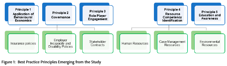 RESULTS: Three themes emerged from the study; (i) role players and their functions with collaboration is integral to disability claims management, (ii) various factors promote and restrict return-to-work planning, and (iii) best practice principles in the DCM pathway that promote return-to-work. These principles include behavioural economics as the central principle, with resource identification and competency, governance, role engagement and education and awareness as supporting principles.