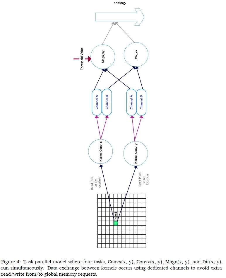 The optimization process begins by choosing the appropriate parallel model for the accelerated device, namely, a task-parallel model. Many experiments have been performed to select among the best possible combinations of optimization procedures, including dividing the device code into four separate kernels, each of which is executed using a single thread, as shown in Figure 3. These kernels are Convx, Convy, Magn (x, y), and Dir(x, y). The idea of the task parallel model is to let multiple threads work on different tasks simultaneously. The first two kernels are completely independent, and they can run simultaneously. However, the calculations in the last two kernels depend on the results from the first two kernels. In the conventional implementation (conventional implementation means that it is similar to the original C program without modifying the code to use any possible optimization techniques), the output results from the first two kernels should be written back to the global memory before calling the last two kernels. The first adopted optimization technique uses high-speed channels (internal local buffers implemented using RAM blocks and registers) to avoid this lengthy operation as well as avoid copying results back to the global memory and rereading them as inputs to the last two kernels. In the first two kernels, after calculating the Gx(x,y) and Gy(x,y) for a pixel located at (x, y), the result will be forwarded to both Magn(x, y) and Dir(x, y) kernels using dedicated channels so that all four kernels can operate together simultaneously as shown in Figure 4. This process should be performed for all pixels, where multiple pixels are read in every iteration to magnify memory bandwidth utilization.