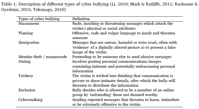 In line with RAT, learners are exposed to online risks in the classroom and outside the school environment. There are different types of cyber bullying that teachers must be cognisant of when dealing with this issue. Table 1 below provides an overview of the different types of cyber bullying.