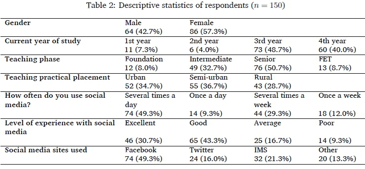 The results in Table 2 show that the majority of the respondents were black females in their third year of study for a Bachelor of Education degree for the senior phase. The placement for teaching practical's was evenly spread out between urban and semi-urban while 28% of the respondents attended a rural school for their practical placements. The majority of the respondents used social media daily, with Facebook being the most popular social media site. The respondents indicated that they were comfortable with social media and had a 'good' knowledge of the technology.