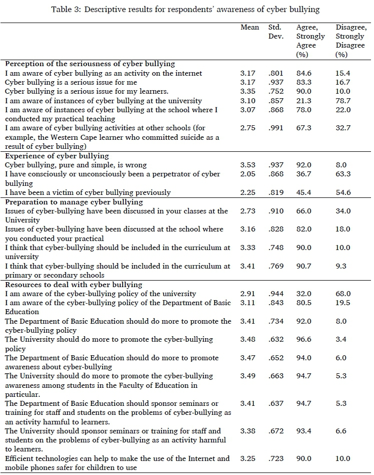 Macaulay et al. (2018) found that teachers' beliefs about bullying would predict how they intervened when faced with cyber bullying. In this study, the vast majority of the respondents indicated that cyber bullying was a serious issue. However, their awareness of the prevalence of the issue decreased outside the classroom. This is similar to the results reported by Li (2010) which indicated the covert nature of cyber bullying, meaning that many are not aware of the prevalence of the problem. This could indicate that they perceive cyber bullying to only be a problem at school level because the learners had reported the problem to the teachers who are supposed to deal with the problem, while the respondents did not believe that it is a national problem or could happen at university as well as they not having experienced it at that level. This lack of awareness of the topic in the South African context shows that they need to be educated on the topic as citizens and future teachers (Kritzinger, 2017).