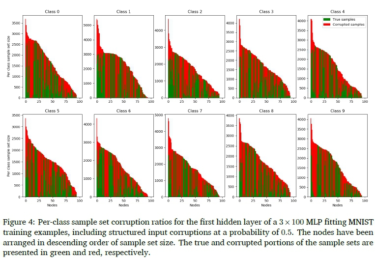 • Networks are able to ignore noise in the first case (input noise), since sub-units of ReLU-activated MLPs are fitted to sub-populations of the training set based on local similarity. Specifically, individual nodes tend to activate for noise or true data, rather than a combination of both. This means that features learnt from corrupted samples have no effect on noiseless test results.