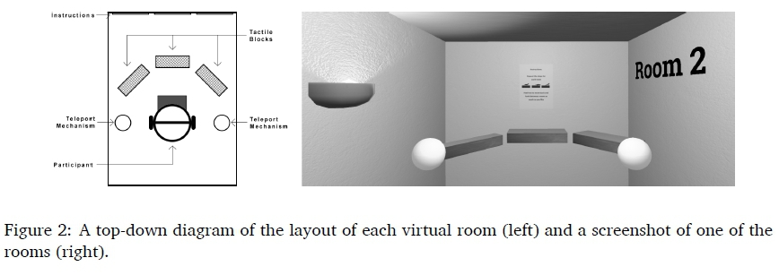 The prototype was divided into nine virtual rooms and participants could "teleport" through these rooms by touching virtual floating orbs. The first room was aimed at introducing participants to the virtual environment and hands and each of the rest of the rooms representing a related set of implementation strategies to induce pseudo-tactile feedback. The introductory room contained instructions and a surface with blocks which participants could interact with and move around using their virtual hands.