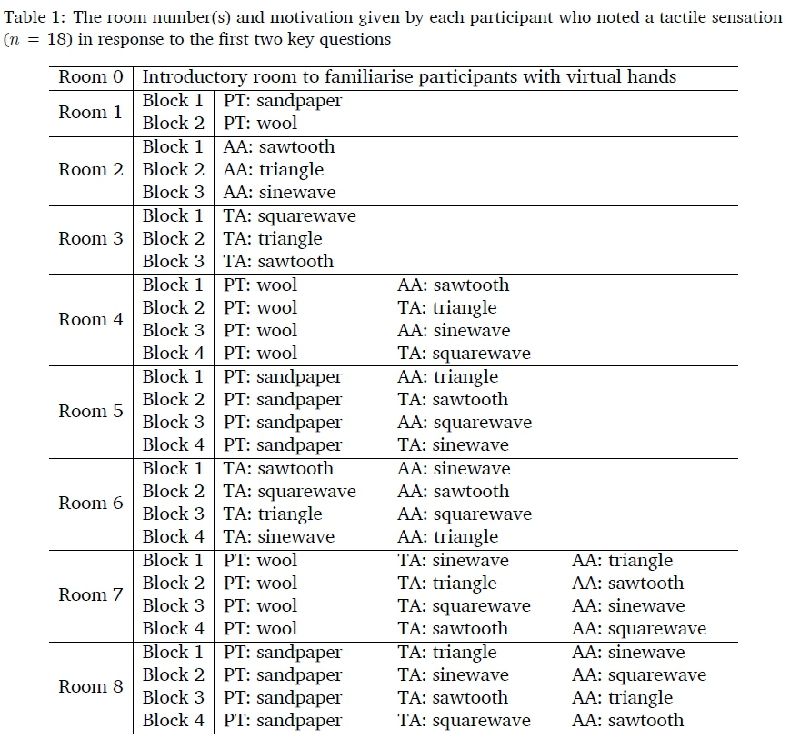 With regards to realism and believability, as mentioned, the interview included a key question aimed at why certain tactile blocks elicited more effective pseudo-tactile sensations than others. Referring again to the second key question ("Can you elaborate on why that room's touch experience felt more real than the others?"), 14 out of 18 participants who noted an illusory response cited either a sense of realism or believability as the key component, for example: