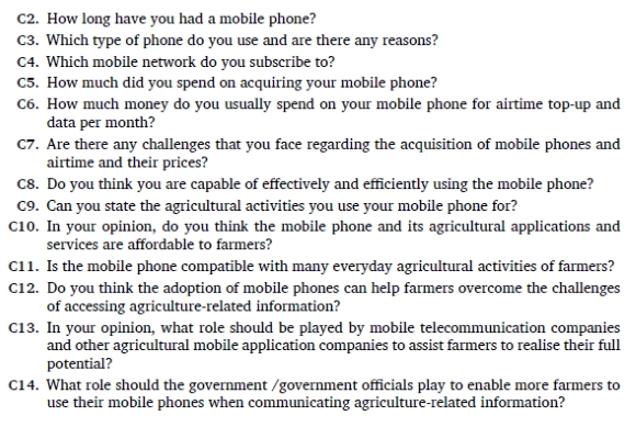 Data was mainly collected from smallholder farmers, while agricultural extension service staff and other vital informants in the value chain were also chosen as relevant populations. All 16 interviewees were smallholder farmers and the focus group participants included small-holder farmers, agricultural extension officers and other key stakeholders in the agriculture value chain. Participants were purposefully chosen to meet a variety of variables like their age, gender, level of education, family size, and farming experience to ensure a representative sample. Focus groups allow participants to build on each other's ideas. They can lead to more discussion than individual interviews since they allow for greater closeness and depth of information (Krueger & Casey, 2014). Participants may feel more at ease in a focus group. Still, it may be preferable to conduct individual interviews if the subject matter is sensitive (such as poverty or a lack of understanding of mobile phone use). Focus groups and interviews produce data with the same level of detail. This research used 16 interviews and one focus group to complement one another and ensure that multiple data sets were gathered. The focus group discussion was necessary to validate and amend the data obtained from the 16 individual interviews, thus leading to data saturation.