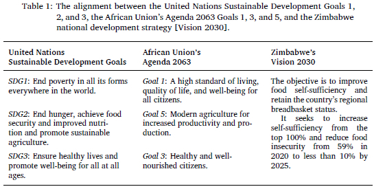 The research is also directly in line with Agenda 2063, Goal 1: A high standard of living, quality of life, and well-being for all citizens; Goal 3: Healthy and well-nourished citizens; Goal 4: Transformed economies; and Goal 5: Modern agriculture for increased productivity and production (Quandt et al., 2020). The government of Zimbabwe also developed its national strategic plan titled Vision 2030 and the National Development Strategy 1 (NDS1) to enhance Zimbabwe's food self-sufficiency status (Government of Zimbabwe, 2020). The macroeconomic measures crafted under this strategy also aim to raise smallholder farmers' agricultural output and productivity, among other things, provide adequate nutrition and food for their families, higher earnings, an increased likelihood for value addition, and the creation of value chains for the agro-business industry (Heeks & Ospina, 2019). Table 1 links the SDGs, Agenda 2063, and Zimbabwe's national development strategic plan [Vision 2030].