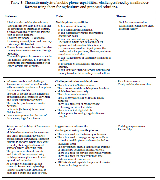 The transcription and coding process of the FGD and interview data resulted in coded data grouped according to the collective factors unveiled among FGD participants and interview participants. The data analysis approach, rooted in a bottom-up or abductive methodology, aimed to capture the nuanced perspectives of smallholder farmers regarding their adoption and use of mobile technologies in agricultural activities. The researchers followed the process for thematic analysis outlined by Braun and Clarke (2006). This involved familiarisation with the data corpus, categorisation and generation of initial codes, pattern identification, and critical theme evaluation and refinement. The researchers finally developed a thematic table to categorise and illustrate the relationships between themes and their associated codes, clearly representing the findings.