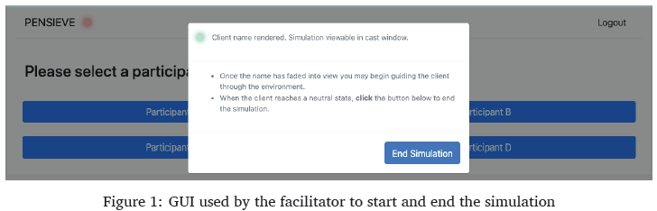 The PENSIEVE prototype, designed and developed for this study, consisted of a Meta Quest 2 HMD which ran a VR application using Unreal Engine 4 (UE4) via a Windows PC and was controlled using a simple graphical user interface (GUI) as shown in Figure 1.