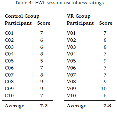 Table 4 illustrates that the facilitator experienced both treatment methods as being assist-ive to the overall process of SHIP® with no one method clearly perceived as superior by the facilitator. However, the HAT scores also provide insight into the individual experiences had by participants, what aspects of VR and the traditional SHIP® process led to these experiences and why the facilitator perceived them to be assistive or not.