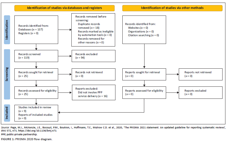 There has been an increasing interest in implementing PPPs in some SSA countries to improve public health systems (Kula & Fryatt 2014; Loxley 2013; Mabunda, London & Pienaar 2018; Thadani 2014; Walwyn & Nkolele 2018). In Lesotho, for instance, the private sector helped to renovate and redevelop Queen Mamohato Memorial Hospital in Maseru, a public institution (Lang 2016). Moreover, the government collaborated with a local church in Uganda to build Ruharo Mission Hospital (Asasira & Ahimbisibwe 2018). Consequently, PPPs can leverage resources by forming mutually beneficial partnerships with private healthcare providers to create an effective, efficient and responsive public health sector by transferring private sector technical skills, innovation and resources (Raman & Björkman 2015; Suchman, Hart & Montagu 2018; Whyle & Olivier 2016). Globally, governments are tasked with improving their healthcare systems to meet the needs of most citizens who rely on public health systems. As a first step towards generating evidence to develop a PPP model for physiotherapy services in South Africa, our study systematically mapped and described available research evidence on PPP models for rehabilitation service delivery in a global context.