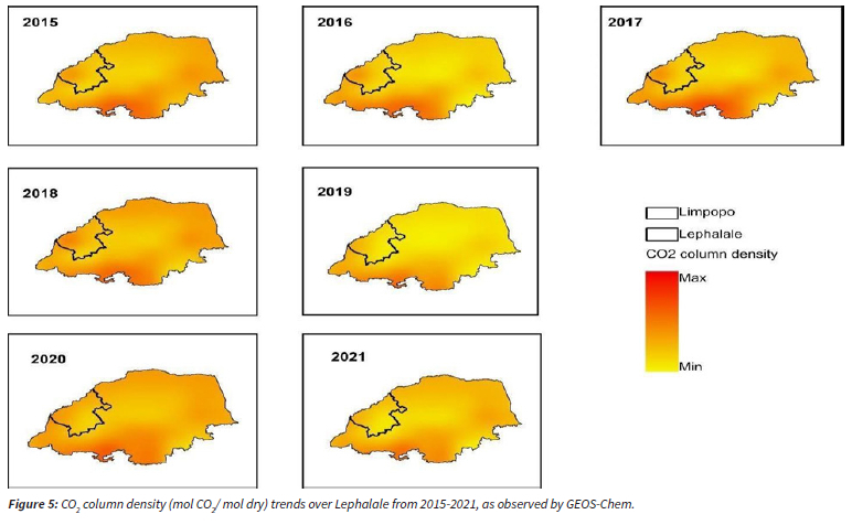 The spatial distribution of carbon monoxide, as shown in Figures 5 and 7, is not quite apparent, especially within Lephalale, where the Medupi Power Station is located. However, it is quite noticeable within just Limpopo. That said, a large amount of CO present within the study area is undoubtedly due to the burning of biofuel and biomass more than it is due to fossil fuel burning (Kumar et al., 2011; Shikwambana & Tsoeleng, 2020). As it stands, there is no evident trend change of CO in Lephalale because, even though both progressive and retrograde intersect within boundary layers (insignificant change), only the retrograde series extends beyond the (lower) boundary layer; there is no clear beginning of a trend or significant change in its occurrence.