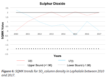 Figure 6 shows a trend of the SO2 column density from 2010 to 2017 in Lephalale. It shows an increasing trend from the later months of 2010 until 2013. From 2014 onwards, there has been a fluctuating trend in the emission of SO2: a gradual decline in 2014, a gradual increase in 2015, a decline from then into 2016, and then emissions pick up again into 2017. This steady rise between 2010 and 2013, as having been mentioned before, may strongly have been due to the transfer of emissions between Mpumalanga and Limpopo, affecting the presence of GHGs in both provinces. Fluctuations between 2013 and 2017, wherein their column densities and trend lines are still higher than pre-2013, are a result of the full electricity generation of coal-fired power stations and the full operation of coal mines, the Grootegeluk in particular (Shikwambana et al., 2021). Thus, change seems to contradict itself as the u(t) and u'(t) intersect within the two boundary layers, showing insignificant change in the emissions of SO2, while the years 2013 and 2015 cross over a little beyond the upper boundary layer, which is interpreted as significant change.
