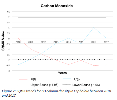 Figure 7 shows no evident trend change of CO in Lephalale. Even though both progressive and retrograde intersect within boundary layers (insignificant change), only the retrograde series extends beyond the (lower) boundary layer, and there is no clear beginning of a trend or significant change in its occurrence. A large amount of CO present within the study area is undoubtedly due to the burning of biofuel and biomass more than it is due to fossil fuel burning (Kumar et al., 2011; Shikwambana & Tsoeleng, 2020).