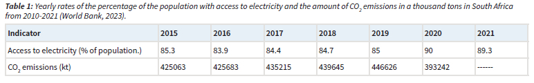 South Africa's reliance on fossil fuels and solid biomass for energy is well-established (Akinbami et al., 2021; Obileke et al., 2024), driven by a growing population and rapid urbanization, which increases the demand for energy and industrial development (Nuissl & Siedentop, 2021). A significant portion of emissions comes from the burning of coal for electricity generation, especially in urban and expanding rural areas in South Africa and worldwide (Runsten et al., 2018). For instance, Australia in the Global North generates over 70% of its electricity from coal, while South Africa relies on coal for more than 77% of its electricity needs (Ncipha & Sivakumar, 2022). The key difference lies in population density: while Australia's smaller population enjoys more widespread access to electricity, South Africa faces challenges in equitable distribution, as shown in Table 1.