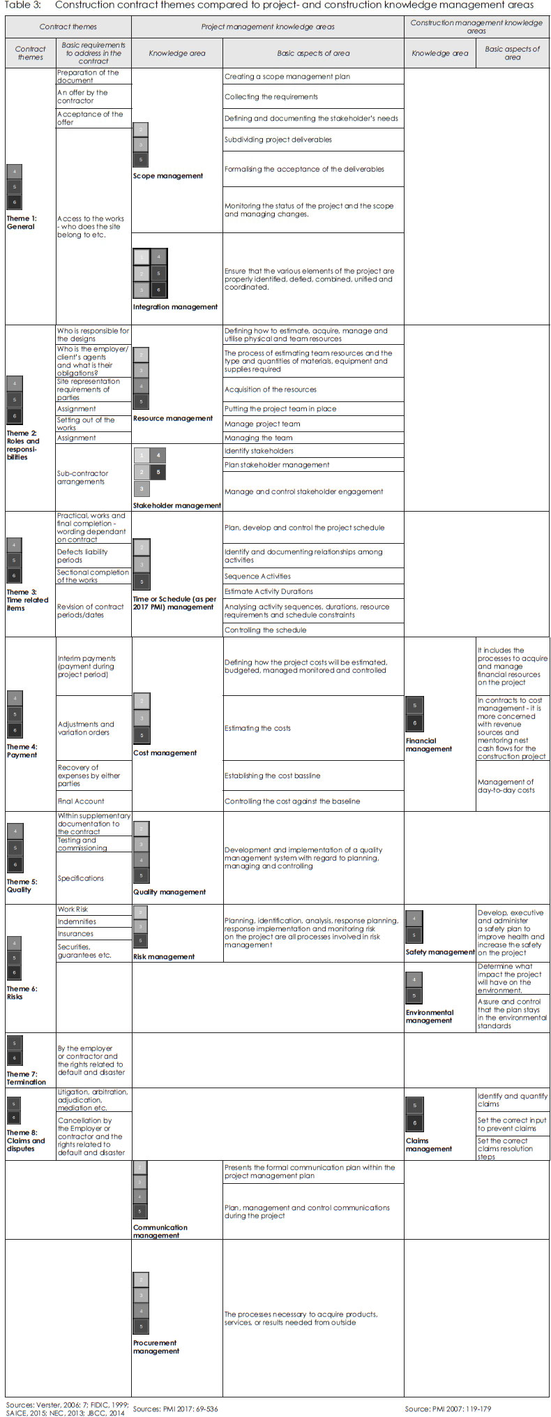 Compared to the main construction project management knowledge areas, these themes show that the controlling parameters of a construction project are identified through the main contracts used in South Africa. These controlling parameters include seven areas with particular similarity.