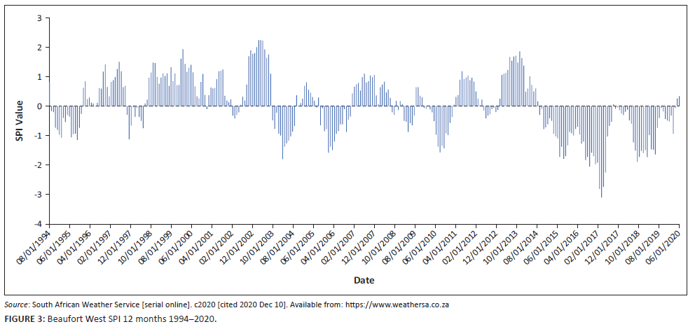 Annual precipitation data were gathered from the South African Weather Service (SAWS) for the period 1993-2020. These data were used to create two graphs, the first provided a representation of annual rainfall for the area by adding the total precipitation for each year and dividing the total of all the years from 1993 to 2020 by the number of years (i.e. 27 years). The second graph is known as a Standard Precipitation Index (SPI). The SAWS data were processed and analysed using the SPI software package of the University of Nebraska's Drought Mitigation Centre. This was performed to calculate the average rainfall in comparison to the previous 12 months for each year over a 40-year period. The advantage of using an SPI over a 12-month period is that it highlights how the rainfall in an area compares to previous years' rainfall while using sampling data over a longer period. This makes the results more reliable and less divergent as would occur with a shorter period such as a 3- or 6-month SPI.13 The SPI was used to calculate the average rainfall in comparison to the previous 12 months over a 40-year period. The SPI generally notes years from 0 to -1 as being low rainfall years, from -1 to -2 as being severe drought years and from -2 to -3 as an extreme drought. These graphs illustrate the decreasing precipitation tendencies in the Beaufort West area during the period 1993-2020.14