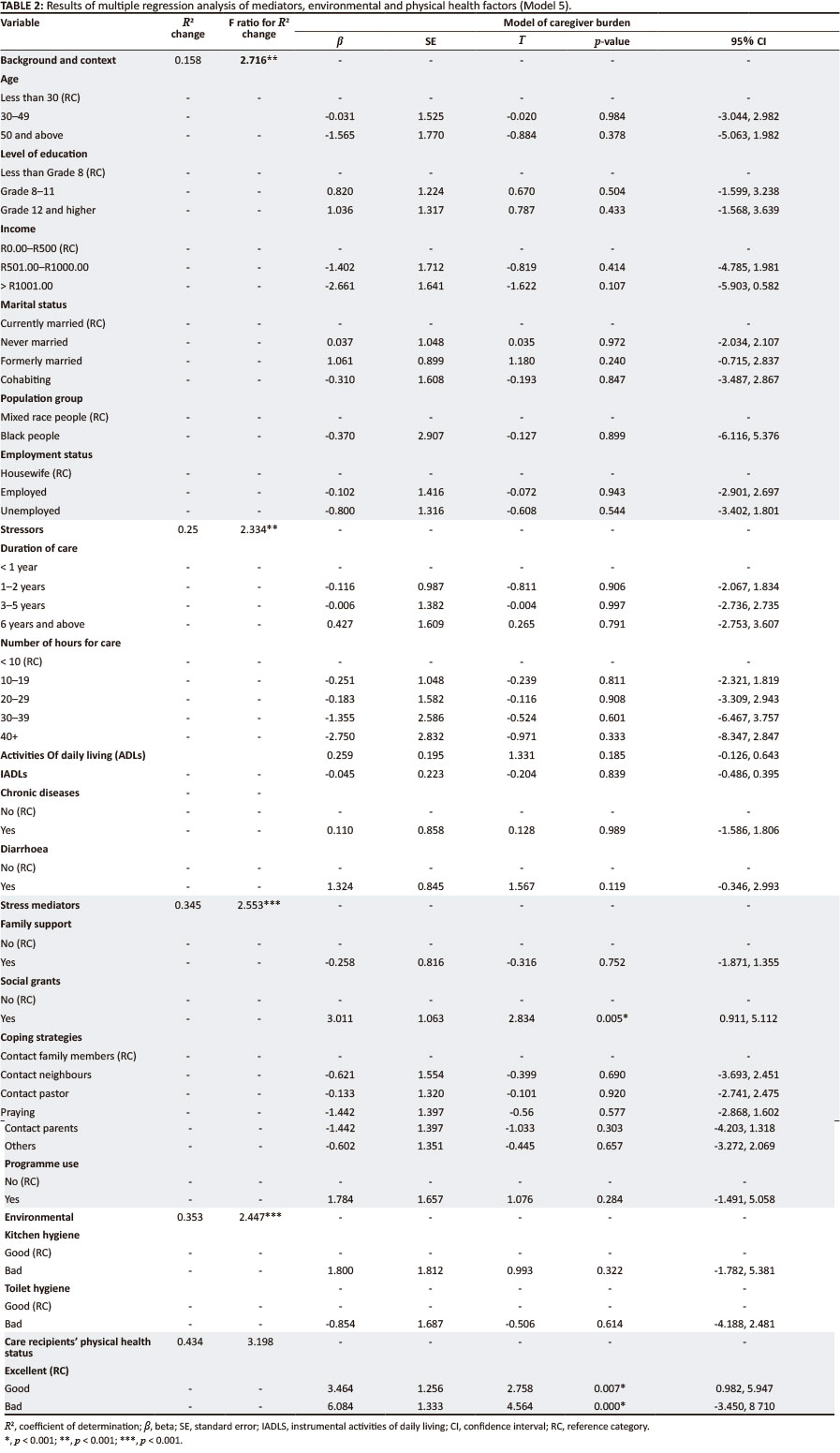 In each of the models, there were additional predictors of FCG burden, with the exception of Model 4, in which the hypothesised construct (environmental health - kitchen hygiene and toilet hygiene) did not show any effect but slightly increased the variation in caregiver burden from 34.5% to 35.3%. The effect of environmental health factors could be nested in key socio-economic factors such as education and income status. Model 1, the population group of caregivers; Model 2, availability of social support in the form of grants; Model 3, chronic disease status of care recipients; and Model 5, social support and physical health or function of care recipients all significantly predict caregiving burden in the study population.