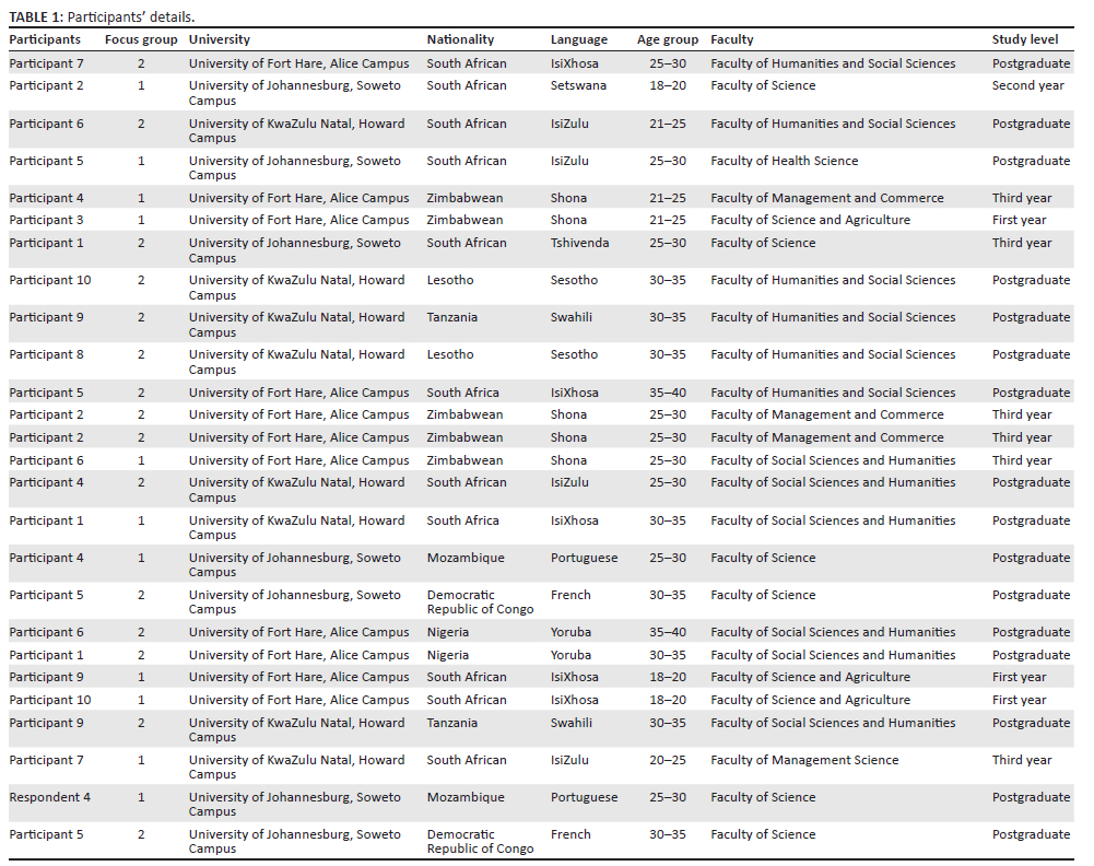 At the University of Fort Hare's Alice Campus, the first focus group consisted of eight participants and the second focus group had seven participants. The first focus group discussion conducted at the University of KwaZulu-Natal's Howard Campus had six multinational participants while the second focus group was composed of eight local participants. Lastly, at the University of Johannesburg's Soweto Campus, the first focus group was composed of five multinational participants while the second focus group consisted of six local participants, making a total of 40 participants when combing all participants in this study. It was noted that it would have been desirable to conduct more focus groups; however, there was a feeling that there could be a repetition of views from the participants. Thus, data saturation was reached with the number of focus group discussions conducted in this study. Regarding the sampling methods, this article employed a nonprobability sampling method. The snowballing sampling technique was used to mobilise students for focus group discussions in library discussion rooms, residence TV rooms and student centres. A snowball sampling method, as argued by Leighton et al.33 is a variable method for mobilising study participants who cannot be accessed easily or known to the research. Furthermore, the data were analysed qualitatively using themes that emerged during the focus group discussions.