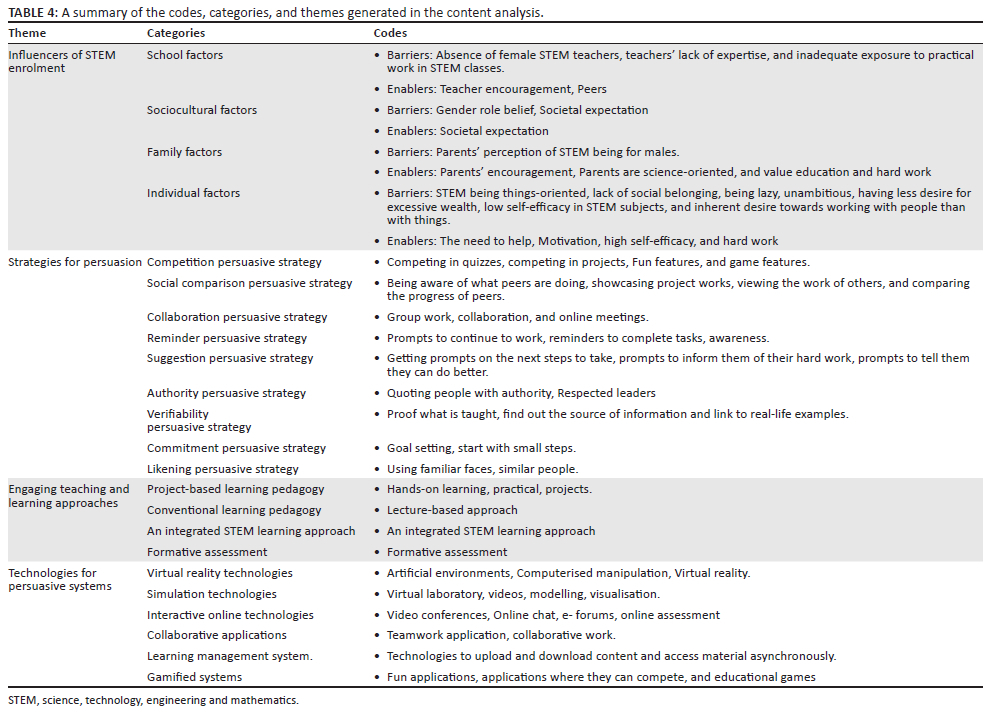 Semi-structured interviews and a focus group session were conducted among junior secondary school female students, STEM teachers and STEM experts in Nigeria and what was gathered was analysed using content analysis and was used to develop the PET4STEM framework that provides designers with more specific design considerations that will equip them to make junior secondary school female students view STEM subjects differently and consequently enrol in STEM pathways. The rationale behind using content analysis was that it allowed the systematic coding and categorisation of large amounts of textual data, retrieved from the interviews, and a focus group, to determine trends, frequency, relationship and discourse of communication.82 The steps followed to analyse the data are outlined next: