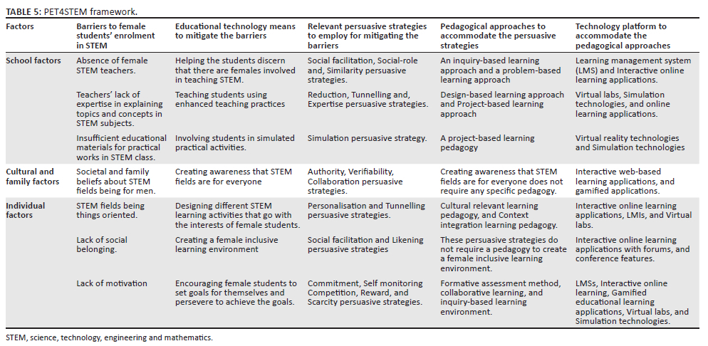 Given these issues, context-specific PT frameworks are required. According to Murillo-Muñoz et al.29 context-specific PT frameworks will provide a more detailed level of design guidelines for specific contexts. A framework for designing PT for motivating young female students in Nigeria to enrol in STEM is important to address the peculiarities surrounding young Nigerian female students' enrolment into STEM pathways. As a result, this article developed a PET4STEM framework for persuasive educational technology (PET)-based tools, so that designers can use the framework to design PTs for motivating young Nigerian female students to enrol in STEM disciplines.