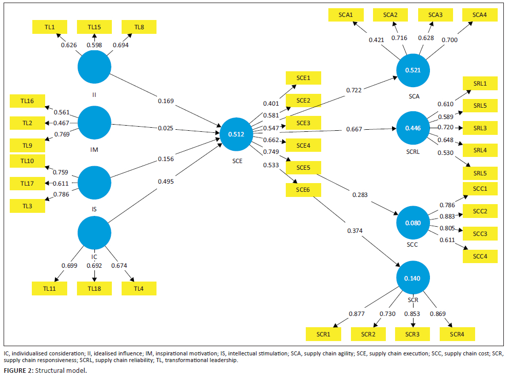 Among the four leadership practices, II (β = 0.169; t = 2.361; p = 0.018) and IC positively predicted SCE (β = 0.495; t = 7.172; p = 0.000). The positive outcome of this relationship confirms that if manufacturing SMEs in South Africa direct their efforts towards the application of the II and IC leadership practices, there is a greater possibility that the implementation of supply chain strategies and processes can be improved. These practices include a positive work environment, excellent reward and recognition programmes, and training and development. Hence, the stronger the II and IC practices in manufacturing SMEs, the better the implementation of supply chain strategies. Although SCM has been successfully implemented in large manufacturing companies such as Samsung, Cummins and Stryker, it remains essential for manufacturing SMEs to establish the most appropriate transformational leadership mix that can impact positively the management of their supply chains.30 Such leadership practices can be applied to the manufacturing SME sector for SCM professionals, managers and owners to deliver quality leadership, which improves both their SCE and SCP.