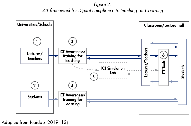 Naidoo (2019) implies that students, as highlighted in number 4, must be provided with ICT awareness and training for learning regularly to be kept abreast with any new ICT developments they may require for online learning. Number 3 in Figure 2 indicates that academics must be equipped with ongoing ICT awareness and teaching for learning. Number 5 provides academics with additional practice to enable them to accurately familiarise themselves with teaching technologies before going to class with the added option to continue until they become proficient with using ICTs for teaching (Naidoo, 2019).
