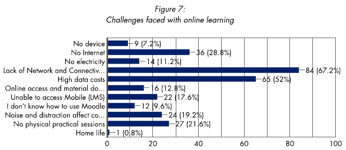 Figure 7 shows the challenges faced by students to engage in online learning. The main challenge was the lack of network and connectivity with the rural areas (67.2%), which hinders online learning. The high data cost (52%) is another obstacle preventing students from accessing their online content as many cannot afford data. Many students have no access to the internet (28.8%), illustrating the disparities faced by many students today. Some students do not have a device (7.2%) to use as a tool to continue with learning.